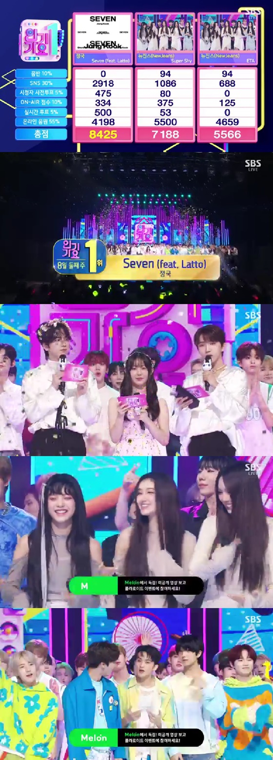 이날 정국은 신곡 '세븐 (feat. Latto)'으로 뉴진스의 '슈퍼 샤이', 'ETA'를 꺾고 1위를 차지했다.