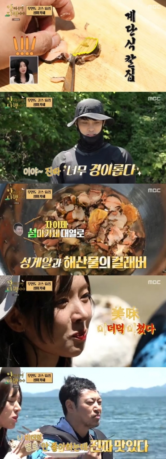 14일 방송된 MBC 예능 프로그램 '안싸우면 다행이야' 136회에서는 무인도에 간 셰프들 레이먼킴, 정호영과 이들의 식자재 납품 팀으로 합류한 성훈, 양치승, 초아의 '자급자족 재료 구하기'가 그려졌다.