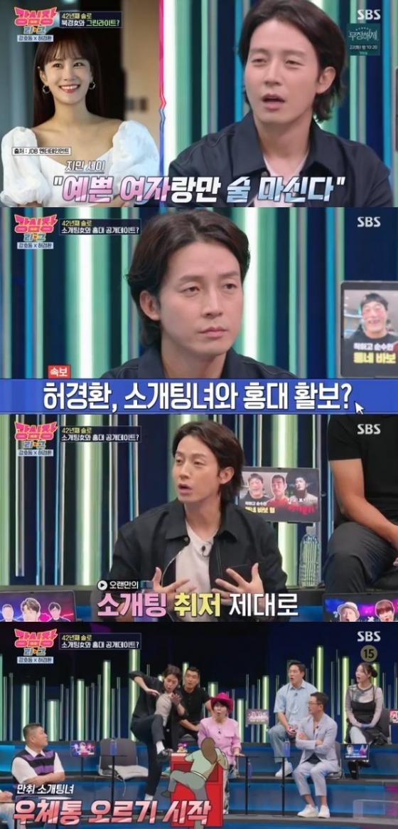 허경환은 '미모의 여성이 없으면 술잔을 안 든다'는 김지민의 증언에 대해 "질문들이 왜 이 지경이냐. 예쁜 여자가 아니고 마음에 드는 여성이 없으면 술잔을 안 든다"고 답해 웃음을 자아냈다. 이어 그는 "술 두 잔, 세 잔 하면 예뻐 보인다. 그러면 마음에도 없는 소리를 한다"고 설명했다.