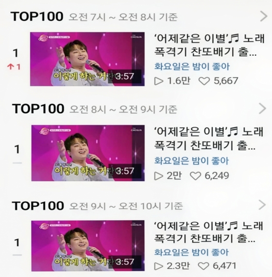 지난 15일 방송된 TV 조선 '화요일은 밤이 좋아'의 '제2회 주현미 가요제'에서 이찬원이 부른 '어제 같은 이별' 무대 영상은 16일 오전 7시부터 오전 10시까지 네이버 TV 1위를 기록하며 화제성을 입증했다.