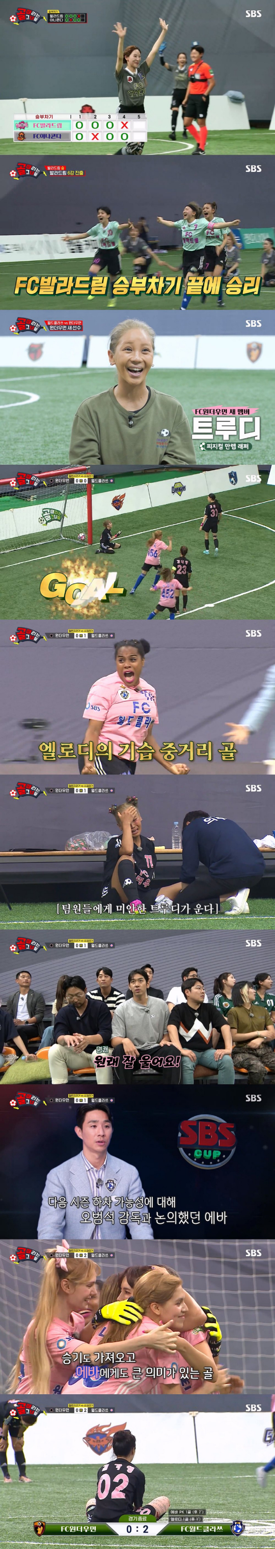 후반전은 아직 지치지 않은 '월드클라쓰'의 기세가 고스란히 드러났다. 후반 1분, 엘로디의 기습 중거리슛이 골망을 가르며 '월드클라쓰'가 선제골을 가져갔다. '원더우먼'은 홍자의 손목 부상으로 트루디가 출전해 뜨거운 집념을 보여줬지만 결과로는 나타나지 못했다. 이에 속상한 트루디가 이마를 치며 울음을 터뜨렸고, 남편 이대은은 그 모습을 보고도 "원래 잘 운다"며 대수롭지 않은 반응을 보여 웃음을 자아냈다.