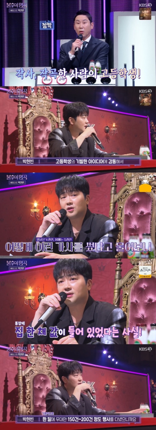 한편, 박현빈은 대표 히트곡인 '샤방샤방'과 어떻게 만나게 되었는지에 대해 비하인드를 밝혔다. 그는 "그 당시에 신곡 발표를 위해 공모를 했다. '샤방샤방'을 작사, 작곡 한 사람이 고등학생이었다. 고등학생의 기발한 아이디어에 감동해서 이 노래를 선택하게 됐다"라고 했다. 그러면서 "그 당시 학생에게 어떻게 '얼굴은 V라인, 몸매는 S라인'라는 가사를 썼냐'라고 물어보니 학교에서 친구들이 가장 많이 쓰는 단어를 모아놨다고 하더라"라고 덧붙였다. 또, "그 노래를 발표하고 제가 활동하는 동안 그 친구는 군에 입대했다. 나중에 제대하고 나니까 본인 통장 잔고에 집 한 채 값이 들어있다고 했다"라고 밝혀 모두를 놀라게 했다.
