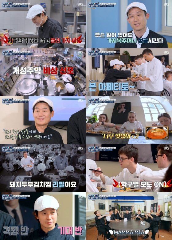 19일 방송된 JTBC '한국인의 식판'에서는 세계 3대 요리학교 알마(ALMA) 국제 요리학교(이하 '알마')에서 성공적으로 미션을 완수해낸 급식군단의 모습이 펼쳐졌다. 미래의 미슐랭 셰프가 될지 모르는 요리학교 학생들의 예리한 혀끝을 제대로 장악했다.