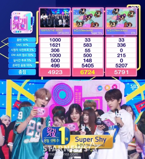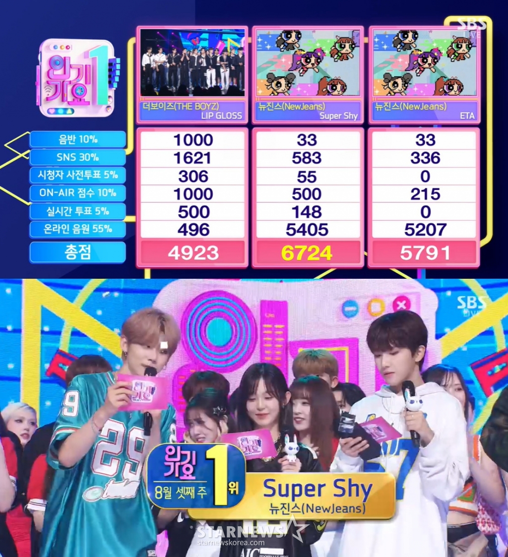 1위 후보로는 더보이즈의 '립글로즈'(Lip gloss), 뉴진스의 '슈퍼 샤이'(Super Shy)와 '이티에이'(ETA)가 언급됐다. 특히 뉴진스는 트리플 타이틀곡이었던 '슈퍼 샤이'와 '이티에이'가 함께 올라 이목을 끌었다. 1위 주인공은 출연하지 않았음에도 압도적인 인기를 보여준 뉴진스가 차지했다.