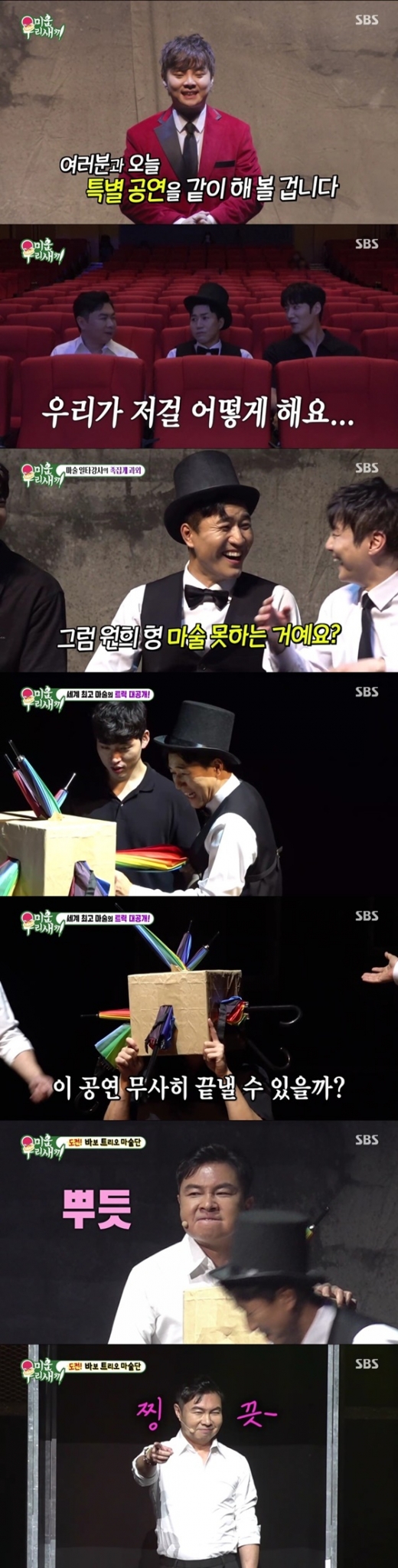 세 사람은 단독 공연에서 선보일 마술을 배우기 위해 족집게 과외를 받게 됐다. 최현우가 "마술사의 첫 번째 자질은 외모다"라며 최진혁을 칭찬하자 김종민은 "그럼 (임) 원희 형 마술 못하는 거냐"라고 되물었다. 이어 마술 트릭을 하나씩 배워가며 연습에 임했지만, 버벅거리며 실수를 연발하는 세 사람을 본 최현우는 "나 심장이 너무 떨려"라며 마술사 27년 인생 중 가장 긴장하는 모습을 보였다. 우려와 달리 세 사람은 본 공연에서는 실수 없이 공연을 마무리했다.