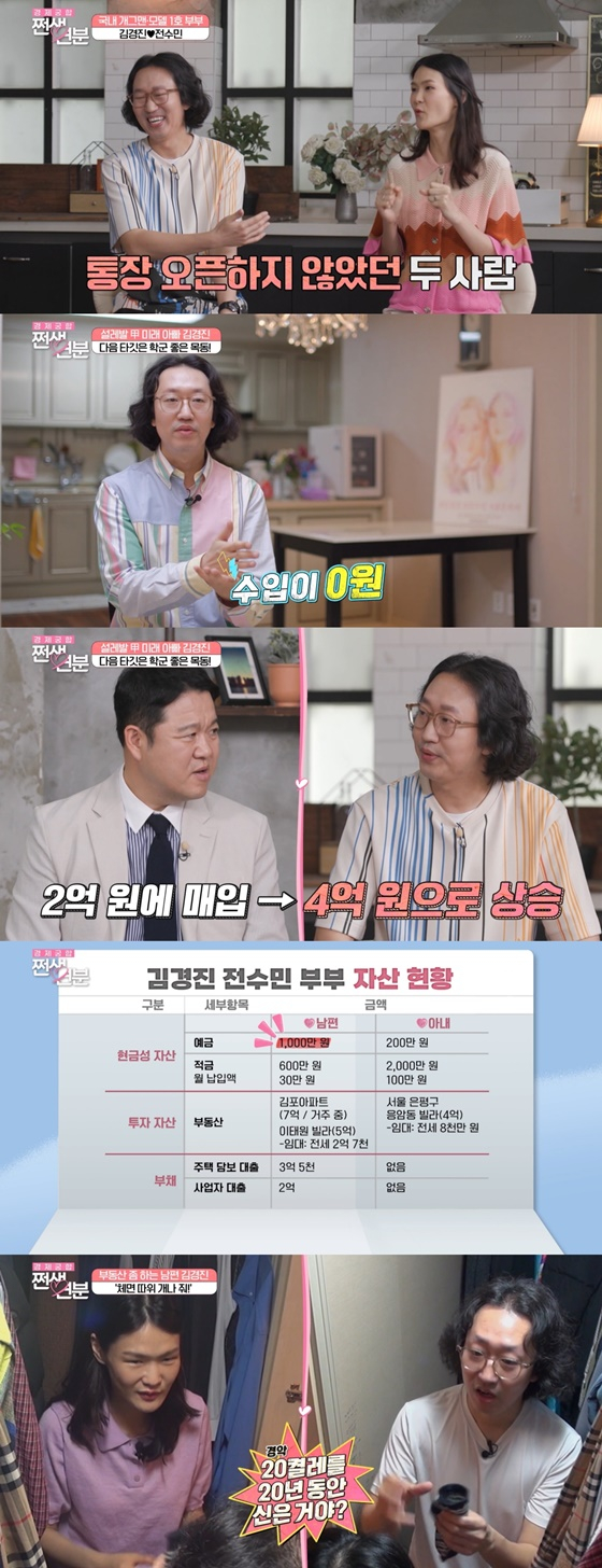 김경진은 구체적인 재무 상담을 받기 위해 부부의 자산과 채무까지 모두 공개했다. 현재 살고 있는 김포의 아파트와 보유하고 있는 이태원의 빌라, 아내 전수민의 명의로 된 은평구 빌라까지 부부가 총 16억 원의 부동산 자산을 보유하고 있음을 밝혔다. 특히 은평구 소재 빌라는 전수민과 결혼 직전 김경진이 선물로 줬다고 밝혀 놀라움을 선사했다.