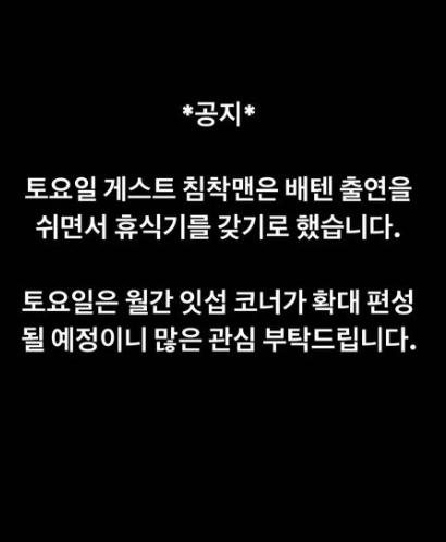 '배성재의 텐' 제작진은 23일 "토요일 게스트 침착맨은 배텐 출연을 쉬면서 휴식기를 갖기로 했습니다"라고 밝혔다.