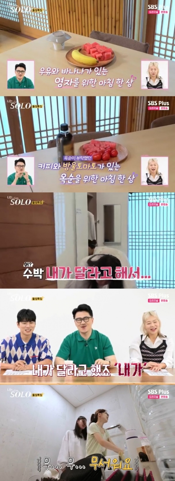 이에 옥순은 "수박 내가 달라고 했다. 내가 달라고 한 게 아니라 '뭐 먹고 싶냐고' 그래서 냉장고에 있는 수박 먹고 싶다고 했다. 근데 갖다주셨다. 광수님이 '계속 뭐 드시고 싶냐'고, 난 안 먹는다고 했는데 그래도 조금 먹으라고 하더라"며 영자를 견제했다. 그러자 영자는 멋쩍은 미소를 지으며 "광수님 되게 섬세하시다"고 대답했다.