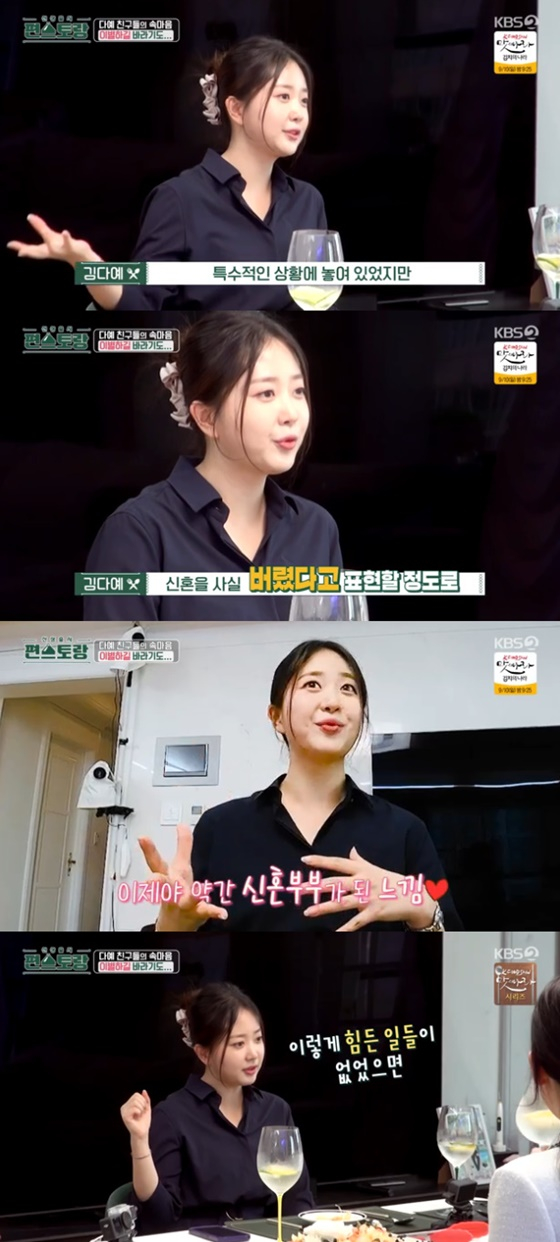 김다예는 "결혼하기 전에 '헤어졌으면 좋겠다'는 사람도 많았다"고 전했다.