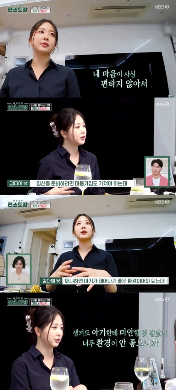 김다예는 임신에 대한 생각을 밝히기도 했다. 그는 "준비를 계속 하는데 내 마음이 사실 편하지 않다. 임신을 준비하려면 마음가짐도 가져야 하는데 '이거 먼저 해결해야 돼' 생각을 했던 거 같다"고 고백했다.