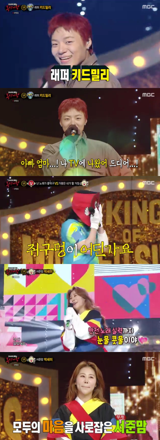 첫 무대를 꾸민 '주차장'과 '세차장'은 남다른 음색으로 탄성을 자아냈다. 결과는 61 대 38로 주차장의 승리였다. '세차장'의 정체는 바로 래퍼 키드밀리였다. 키드밀리는 부모님께서 '복면가왕' 출연을 원하셔서 도전하게 됐다며 "아빠 엄마. 나 TV 나왔다. 낳아주셔서 감사하다"고 인사해 웃음을 자아냈다. 뮤지컬배우 정영주는 "앞으로는 앨범 낼 때 노래도 해 달라. 너무 아깝다"고 극찬을 전했다.