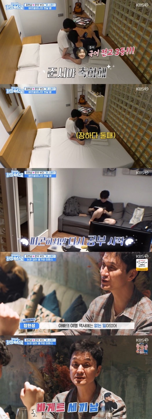 이날 두 사람은 바르셀로나에서 첫날을 보내고 숙소로 들어왔다. 이후 한국에 있는 가족들로부터 연락받았다. 장현성 부인은 "준서가 국어 전교 3등 했다"라며 반가운 소식을 전했다. 이에 장현성은 "준서 축하해. 국어 최강자"라며 칭찬을 아끼지 않았다. 이후 장현성은 수건을 이불 삼아 침대에 곯아떨어졌다. 샤워를 마친 준우는 피곤하지만 잠을 참아가며 내일의 일정을 위해 공부에 들어갔다.