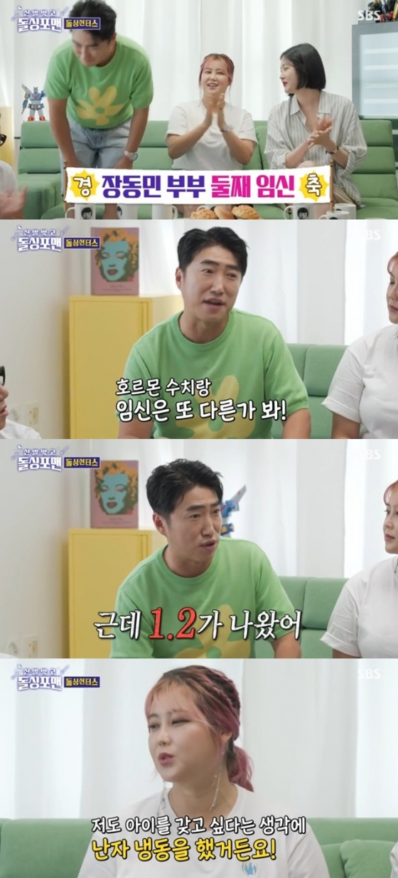 이날 방송에서 장동민은 둘째를 임신한 소식을 전했다. 이상민은 "동민이가 나랑 같이 병원에 가서 호르몬 검사를 했는데 둘이 완전 최악이었다. 그런데 둘째가 생겼다"고 운을 뗐다.