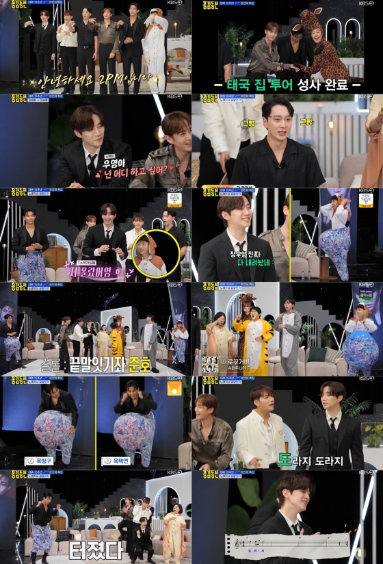 드레스코드 '짐승들'로 분한 기린 홍진경, 하늘 다람쥐 김숙, 늑대 주우재, 호랑이 조세호, 강아지 우영과 함께 데뷔 15주년을 맞이한 '짐승돌' 2PM 준케이, 닉쿤, 택연, 찬성, 이준호 등 2PM 완전체가 함께 했다. '2PM'이 등장하자 주우재는 "우영아 이리 와야지"라며 우영 챙기기를 시작했고, 홍진경은 우영에게 "우리랑 있으면 돌아이인데 저쪽 가니 아이돌인 이상한 애"라며 신기함을 드러내 웃음을 자아냈다.