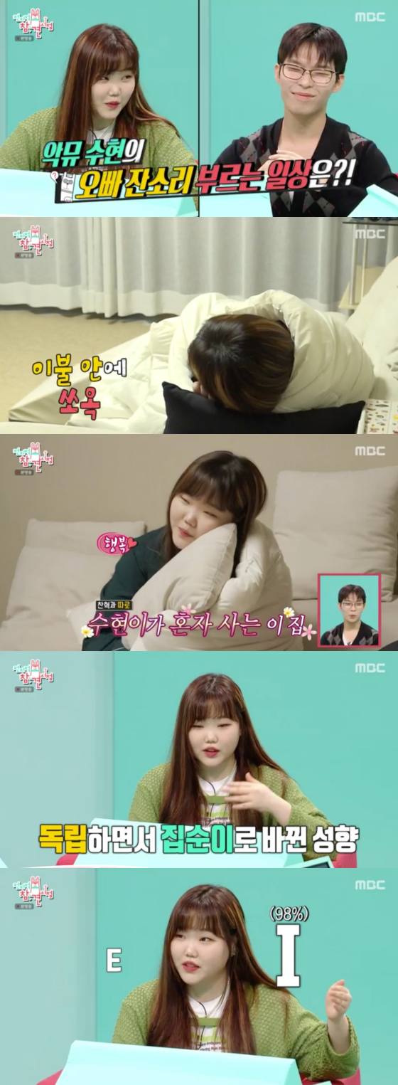 이를 본 찬혁은 "되게 생소하다. 제가 알던 모습이 아니다. 옛날에는 제가 게임하고 TV 보면 와서 혀를 찼다"며 깜짝 놀랐다. 수현은 이에 "완전 외향적이었는데 독립하면서 집순이가 됐다. ESFP였다가 ISFP로 바뀌었다. 지금은 내향성이 98%"라 밝혀 놀라움을 더했다.