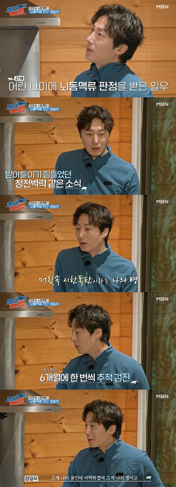 이날 정일우는 27살 당시 뇌동맥류를 진단받았다고 털어놨다. 그는 "내가 아팠잖아. 뇌동맥류가 있는 걸 충격받아서 집 밖에 몇 달 동안 안 나갔다"고 말했다.