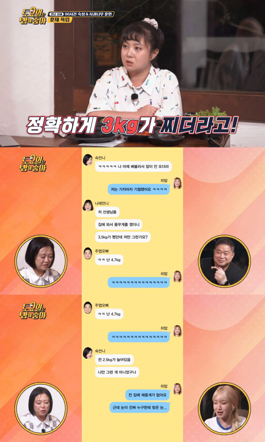 히밥이 공개한 채팅방 속 멤버들은 토밥을 촬영하고 난 뒤 몸무게 변화에 대해 뜨거운 토론을 펼치고 있었다. 김숙은 "배불러서 잠이 안 왔어"라며 촬영 소감을 전했고 박나래는 "촬영 끝나고 집에 와서 몸무게를 쟀더니 3.5kg이 쪄 있는데 나만 이렇냐"라며 질문했다. 이에 현주엽은 "나는 4.7kg"라며 증량 소식을 전했다.