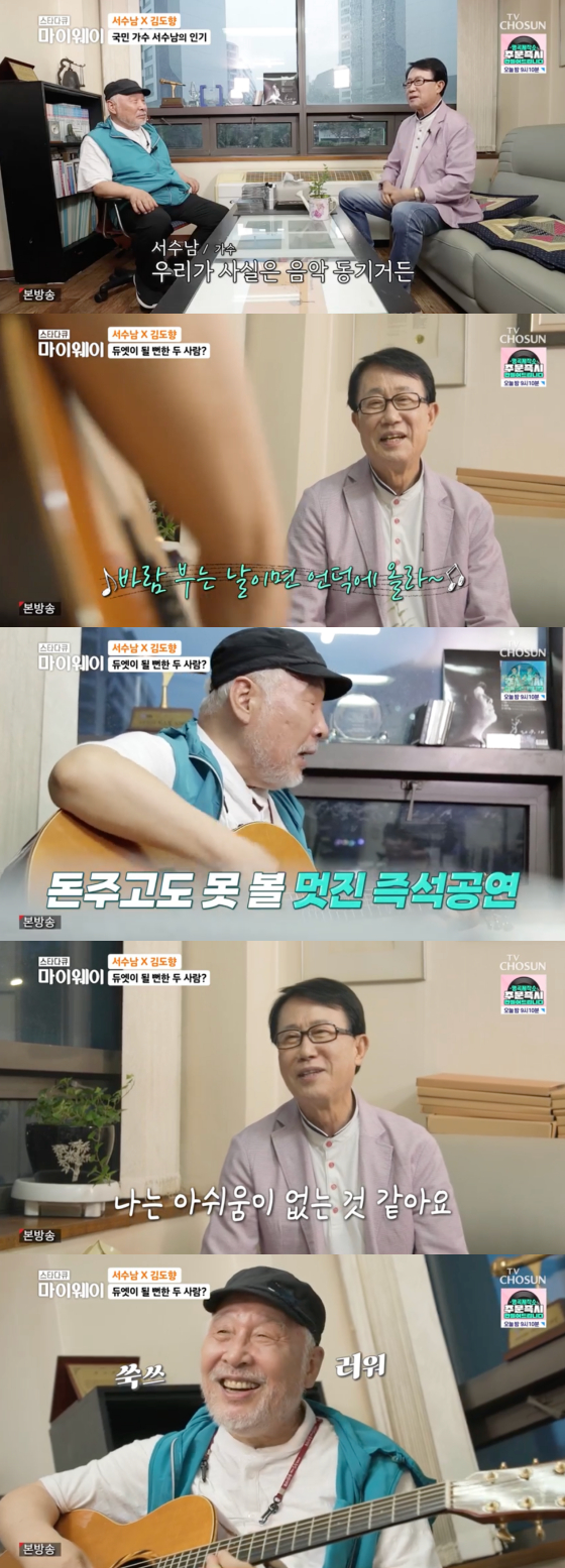 서수남은 당시에도 김도향의 음악을 좋아해 듀엣 요청까지 했던 바 있다 덧붙였다. 두 사람은 이후 화음까지 맞추며 즉흥 공연을 펼쳐 탄성을 더했다. 서수남은 "참 고생하던 시절에 음악했지만 아쉬움이 없다"고, 김도향은 "55년 째 아니냐"며 화기애애한 웃음을 터뜨렸다.