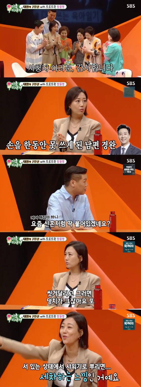 장윤정은 "손을 못 쓰게 되니 해줘야 할 게 많더라"고 덧붙였고, 서장훈은 "신혼처럼 붙어 있겠다"며 흐뭇해했다. 장윤정은 이에 "씻겨 달라고 하는데 (도경완이) 키가 크지 않냐. 서 있는 상태로 샤워기를 뿌리니 세차하는 기분이었다. 나는 아무리 부부여도 구석구석 씻겨주는 건 부끄럽더라"며 쑥스러워 해 모벤져스에 웃음을 안겼다.