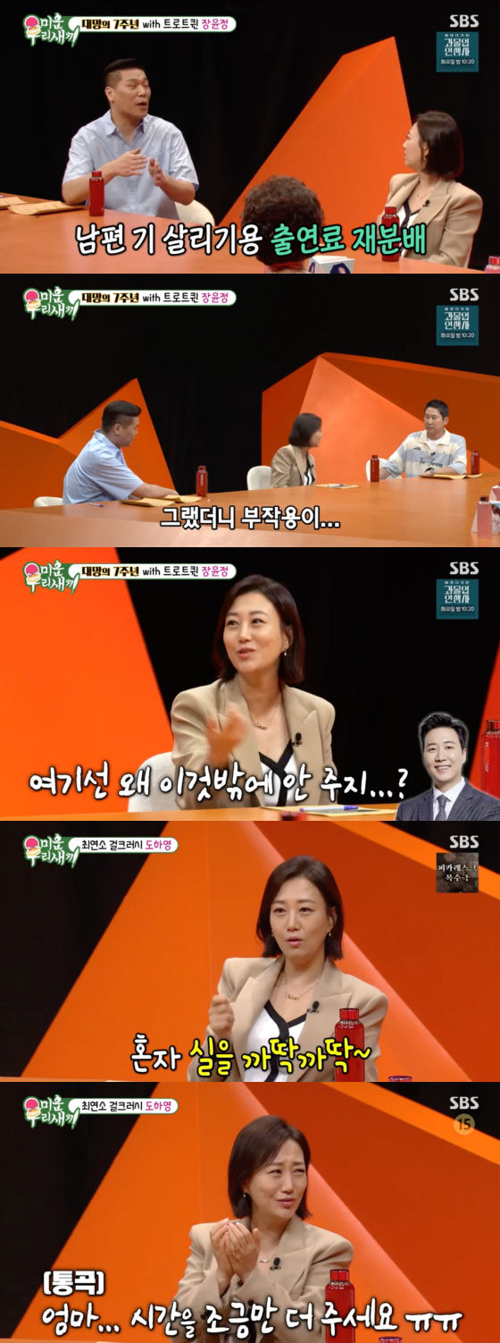 장윤정은 또한 도경완과 출연료 차이가 큰 게 불편할 때가 있다며 "같은 프로그램에 출연할 때는 제작진한테 (제 출연료를) 남편한테 더 달라고 했다"고 밝혔다. 모벤져스는 이에 "현명하다"며 칭찬했으나 장윤정은 "그랬더니 부작용이 생겼다"며 "다른 프로그램에 가서 '왜 나 이것밖에 안 주냐'더라"고 폭로했다. 신동엽은 이에 "그걸 알리려고 이렇게 공식적으로 말한 거냐"고 말해 웃음을 더했다.