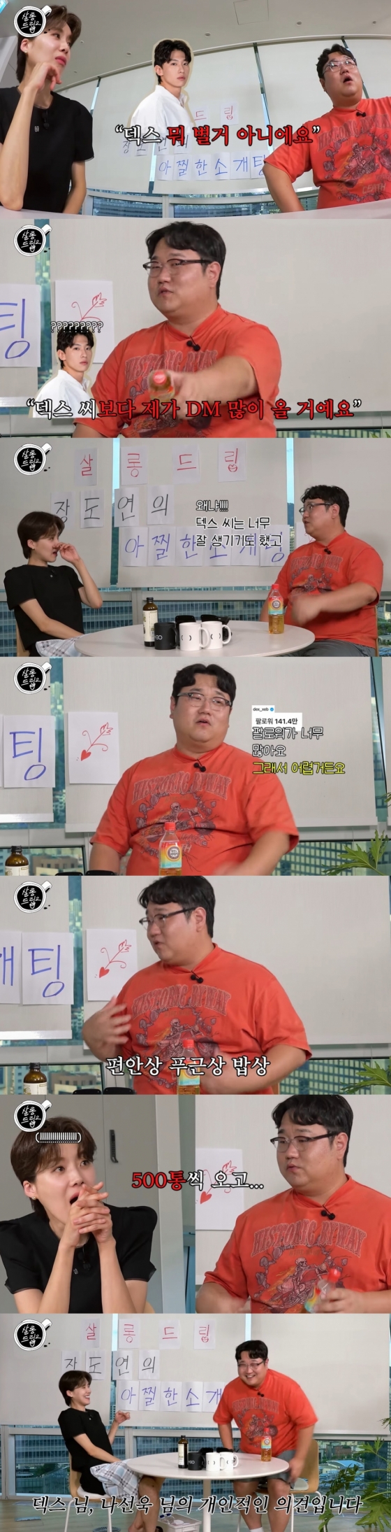 실제로 나선욱은 유튜브 콘텐츠 '문돼의 온도'를 업로드하면 500통이 넘는 DM이 온다고 밝혔다. 장도연은 "하루에 몇백 통이면 진짜 덱스 이기겠다"라며 놀랐고, 나선욱은 "덱스 뭐 별 거 아니다"라면서도 "죄송합니다"라고 사과해 웃음을 자아냈다.