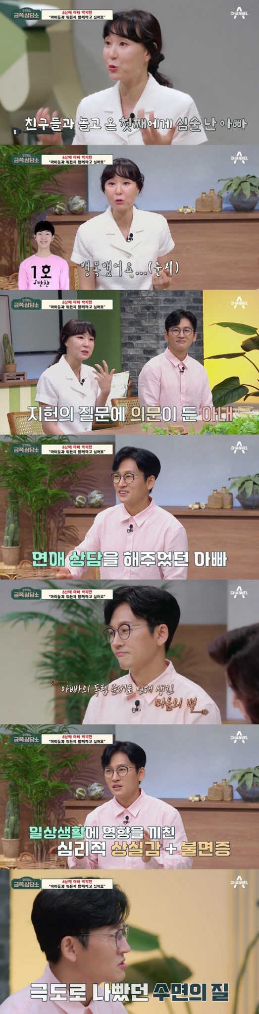 아내는 "이걸 문제라고 생각한 게 (박지헌이) 잠을 못 자면서부터"라며 "최근에는 남편이 1시간에 1번씩 잠에서 깨기도 했다. 마음의 병이 깊어지는 것 아닌가 싶었다"고 걱정했다.