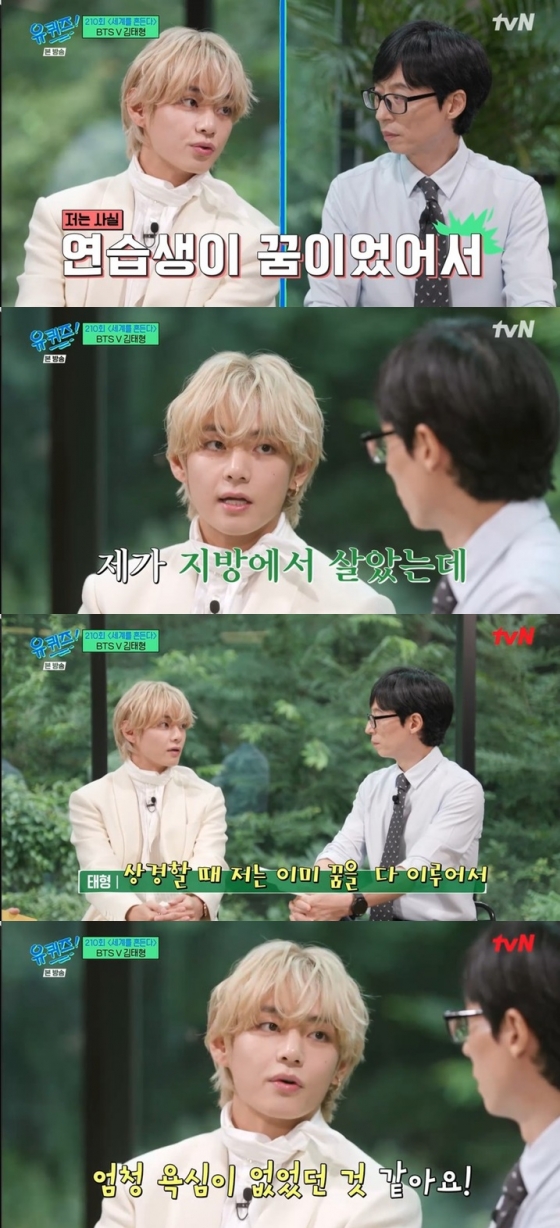 이날 뷔는 "사실 연습생이 꿈이었다"며 "난 지방에서 살았는데 서울 가는 사람들이 성공한 사람이라고 생각했다"고 말했다. 이후 빅히트엔터테인먼트(현 하이브) 소속 연습생이 되어 상경하게 된 뷔는 "꿈을 다 이뤄서 엄청 욕심이 없었다"며 "물 흐르는 대로 시간이 흐르는 대로 그렇게 살았는데 데뷔조가 됐다"고 전했다.