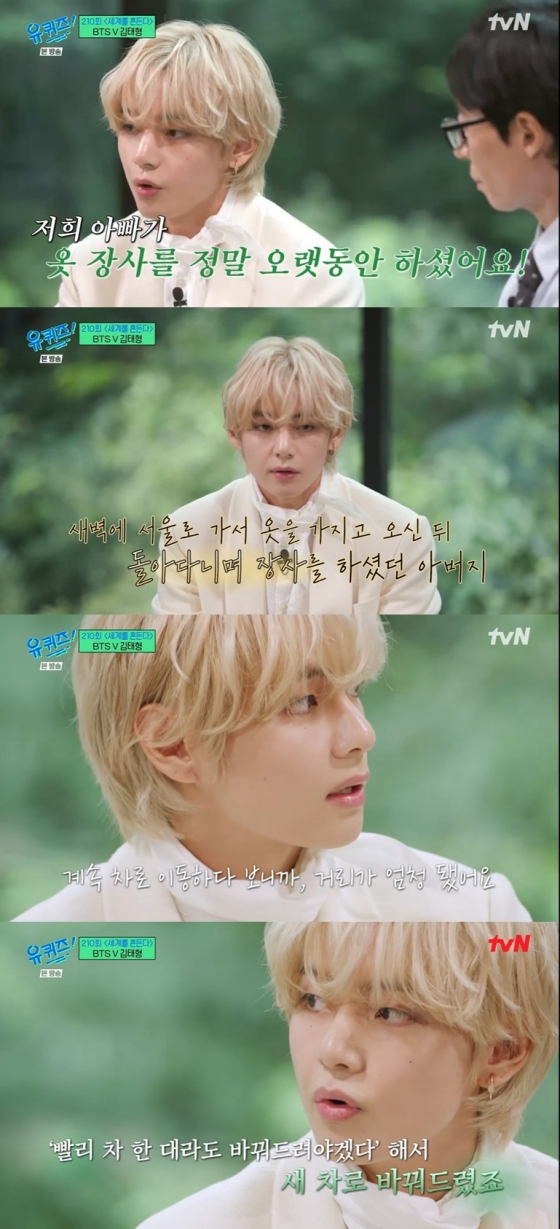 뷔는 "아빠가 옷장사를 정말 오랫동안 했다. 옷을 가져오려면 새벽에 서울 동대문에 가야하는데 계속 차로 이동하니까 거리가 엄청 된다"며 "아빠와 같이 여행을 간적 있는데, (차 계기판을 보니) 50만km가 찍혀 있더라. 그래서 아빠 차를 빨리 한 대라도 바꿔드려야겠다 생각이 들어서 새 차로 바꿔드렸다. (데뷔 이후) 두 번 정도 차를 바꿨다"고 말했다.