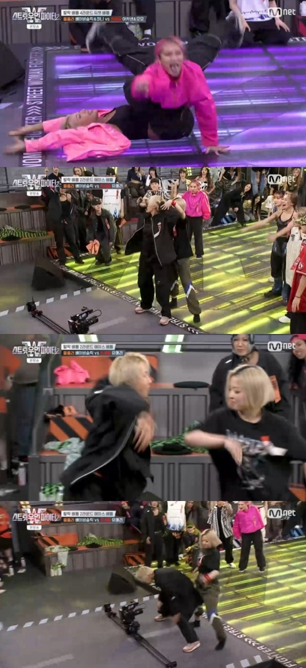 두 팀은 작은 실수도 용납할 수 없다는 듯, 빈틈없는 무대로 현장 분위기를 끌어올렸다. 특히 2라운드에 나선 츠바킬 유메리와 울플러 베이비슬릭은 과열된 분위기 속에서 배틀을 이어가다 몸을 차거나 밟는 사고를 당했다.