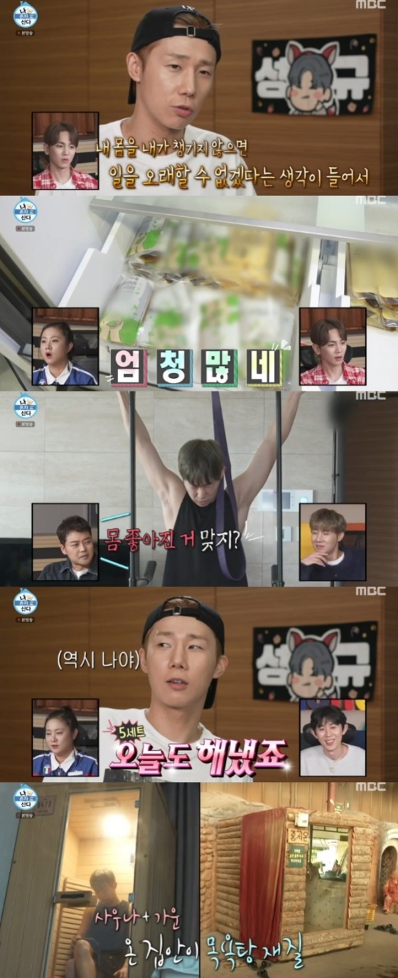 김성규는 턱걸이 총 5세트를 마친 후 안방으로 가 1인 사우나실로 향했다. 그는 "일단 혈액순환과 노폐물 배출에도 좋다. 우리가 삶을 살면서 독이 많이 쌓인다. 그 독을 빼는 거다"라며 설명했다.