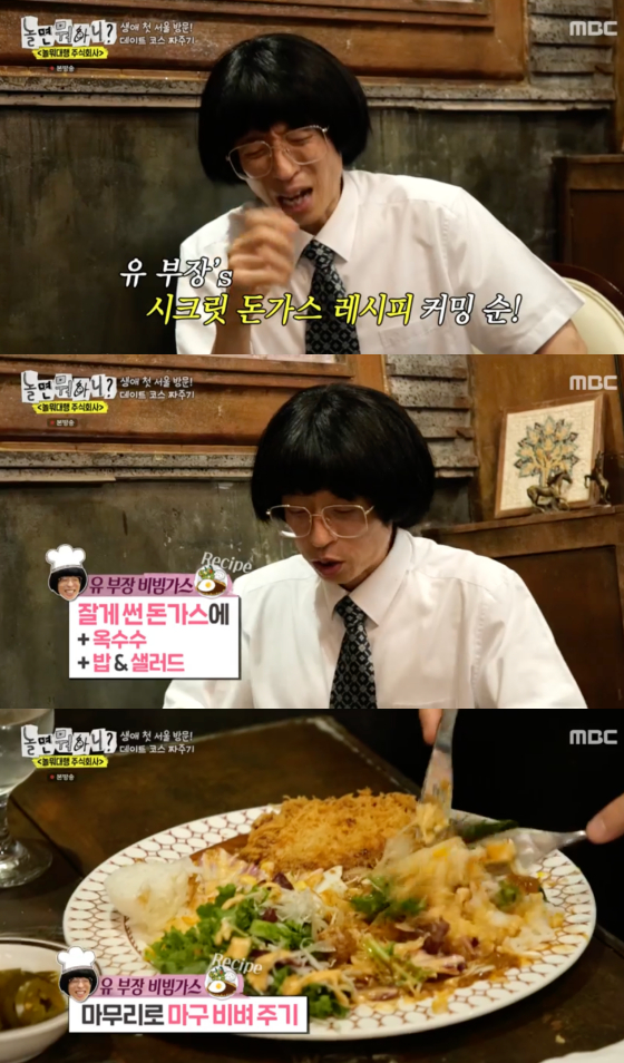 유재석은 이에 흔쾌히 레시피를 공개했다. 이는 돈가스를 작게 썰어 옥수수와 밥, 샐러드, 마요네즈를 함께 섞어 마구 비벼주는 것이었다. 유재석은 "하하도 처음에는 왜 그렇게 먹냐고 했는데 이제는 매번 마무리가 이거다. 기가 막힌다. 너무 맛있다"며 감탄해 기대감을 모았다.