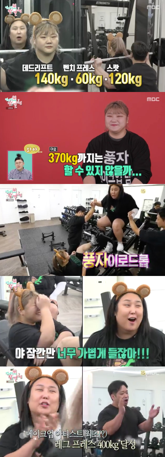 김대영은 아주 평온한 표정으로 레그프레스 400kg까지 성공했다. 풍자는 심지어 헬스클럽에 "원판이 모자라서 더 못 들었다"고 덧붙여 충격을 자아냈다. 풍자는 "너 지금 푸바오 네 마리 드는 거다. 너 뭐하는 애니"라며 당황했고, 김대영은 "그냥 뭐가 왔다 가는 느낌이었다. 400kg 위에 풍자를 얹었어도 재밌었을 것 같다"며 "나 메이크업하는 사람"이라 말해 웃음을 안겼다.