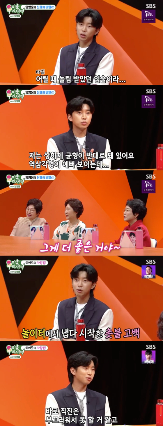 임영웅은 이어 아쉬운 부분은 상하체의 균형이라며 "역삼각형 체형이 예쁘다고 하는데 저는 하체가 두껍고 상체가 얇다. 건강에는 그게 더 좋지만 하체가 좀 더 얇아야 예쁘지 않냐. 하체 관리를 열심히 한다"고 밝혔다. 그러나 신동엽은 "허벅지가 엄청나다. 축구를 계속 해서"라고, 허경환 모친은 "옛말에는 하체 약한 사람 돈도 안 빌려준다고 했다"고 오히려 칭찬을 건넸다.