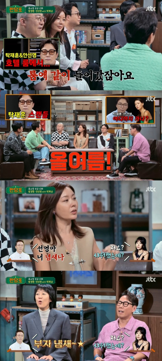 이날 안선영은 갑자기 탁재훈을 향해 "강원도 호텔에서 나 만난 거 생각 안 나냐"라고 말해 탁재훈을 당황케 만들었다. 이어 안선영은 "룸에 같이 들어가지 않았냐. 다른 미모의 여자랑 있지 않았냐. 진짜 팩트다. 올여름이다"라고 덧붙여 홍진경, 윤종신을 깜짝 놀라게 했다.