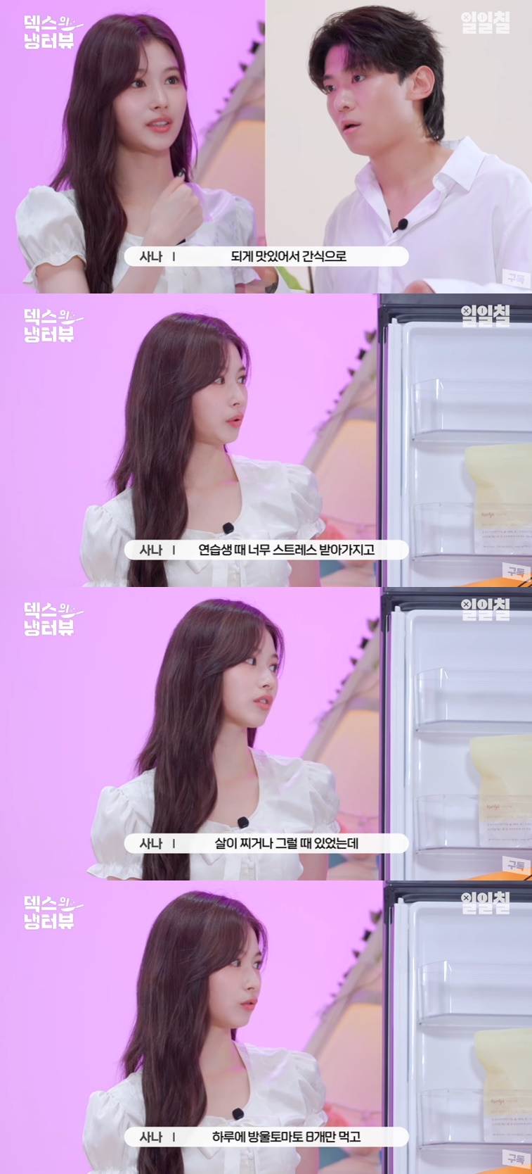 그룹 트와이스 사나가 UDT 출신 방송인 덱스에게 걸그룹 다이어트의 고충을 밝혔다.