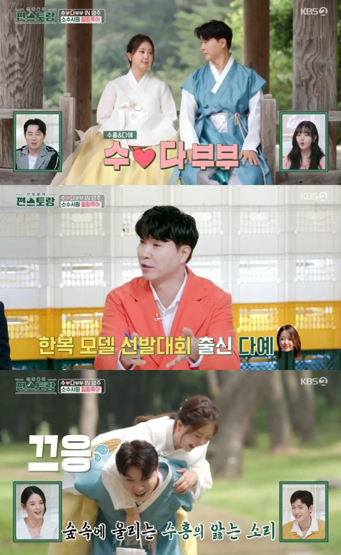산책로를 걷던 박수홍은 김다예에 "부인, 내가 업어주겠다"며 애정을 드러냈다. 하지만 박수홍은 김다예를 등에 업고 허리를 곧게 세우지 못한 채 "한복 무게냐. 한복 안에 뭐가 들었냐"며 앓는 소리를 내 웃음을 유발했다.