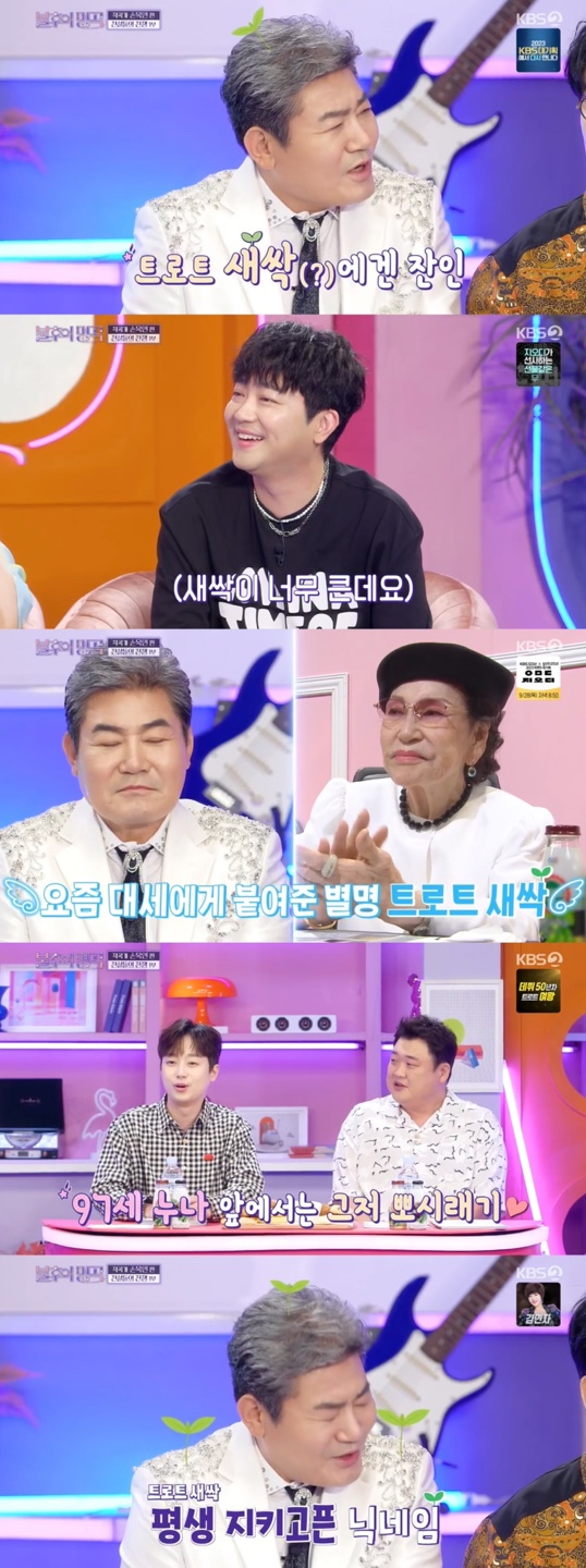 이에 진성은 애교스러운 표정을 지으며 "새싹으로 평생 남고 싶다"라고 했고, MC 김준현은 "아주 귀염둥이다. 오늘 사뭇 귀여우신 것 같다"라고 말했다.