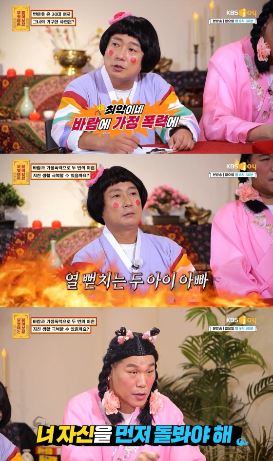 지난 25일 KBS Joy '무엇이든 물어보살' 234회에는 두 번의 이혼으로 번아웃이 온 싱글맘이 출연했다. 두 번의 결혼과 두 번의 이혼을 겪고 아이 둘을 혼자 키우고 있는 사연자가 첫 번째 남편은 바람을 피우고 두 번째 남편은 가정 폭력을 행사해 이혼하게 되었다면서 조언받고자 찾아왔다고 하자 이수근은 "최악이네, 바람에 가정폭력"이라며 분노했다.