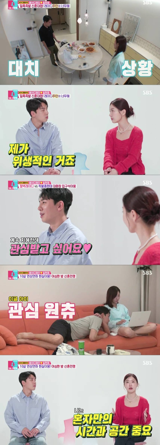 반면, 남편의 전화도 받지 않고 느지막이 일어난 레이디제인은 일어나자마자 게임을 하는가 하면 여동생을 불러 배달 음식으로 식사를 하는 등 여유로운 오전 일상을 보냈다. 이후 레이디제인은 집안일은 물론 식사 뒷정리도 하지 않은 채 낮잠에 빠졌다. 퇴근 후 어질러진 집을 확인한 임현태는 황당한 듯 말을 잇지 못했다. 레이디제인은 "먹고 잠깐 배 꺼트릴 동안 놨다가 치우려고 했던 건데 5분, 10분을 못 기다린다"며 "당신이 조금 급하다는 생각은 안 해봤냐"고 했지만, 임현태는 "그건 급한 게 아니라 오히려 내가 위생적인 것"이라고 받아쳤다. 또한 레이디제인은 "열정 넘치게 행동을 하니까 옆에 있는 내가 상대적으로 쓰레기가 된 느낌"이라고 털어놨다.