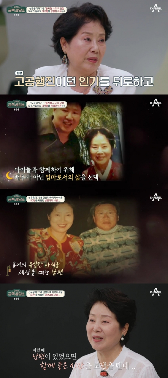 또한 선우용여는 50년간 함께 산 남편과의 사별에 대해 언급했다. 그는 "바쁠 때는 생각이 안 나는데 쉴 때 '남편이 있었으면 참 좋았겠다'는 생각이 든다. 나는 몰랐는데 며느리에게 '난 참 외롭다'고 했다고 하더라. 제가 돈을 버는 동안 남편은 편할 거라고 생각했는데 남편은 부부 사이에 대화를 원했던 것 같더라. 돌이켜 보니까 미안하고 그립다"고 말했다.