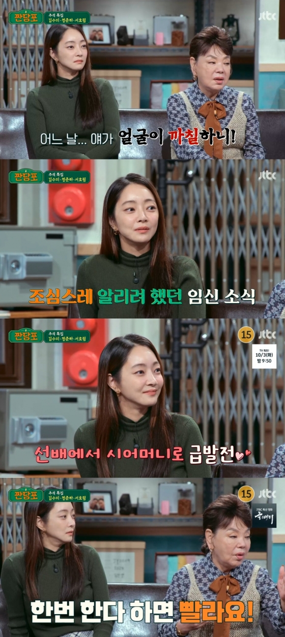 서효림은 시어머니인 김수미가 혼전 임신 사실을 밝혔다고 했다. 김수미는 "(서효림이) 나랑 같이 예능프로그램을 찍고 있었는데 얼굴이 까칠하더라. 왜 그러냐고 물었더니 '요즘 피곤해서 그래요'라고 했었는데 내 손녀를 임신한 줄은 몰랐다. 당시에는 내 아들이랑 연애하고 있는 것도 몰랐다"고 밝혔다.