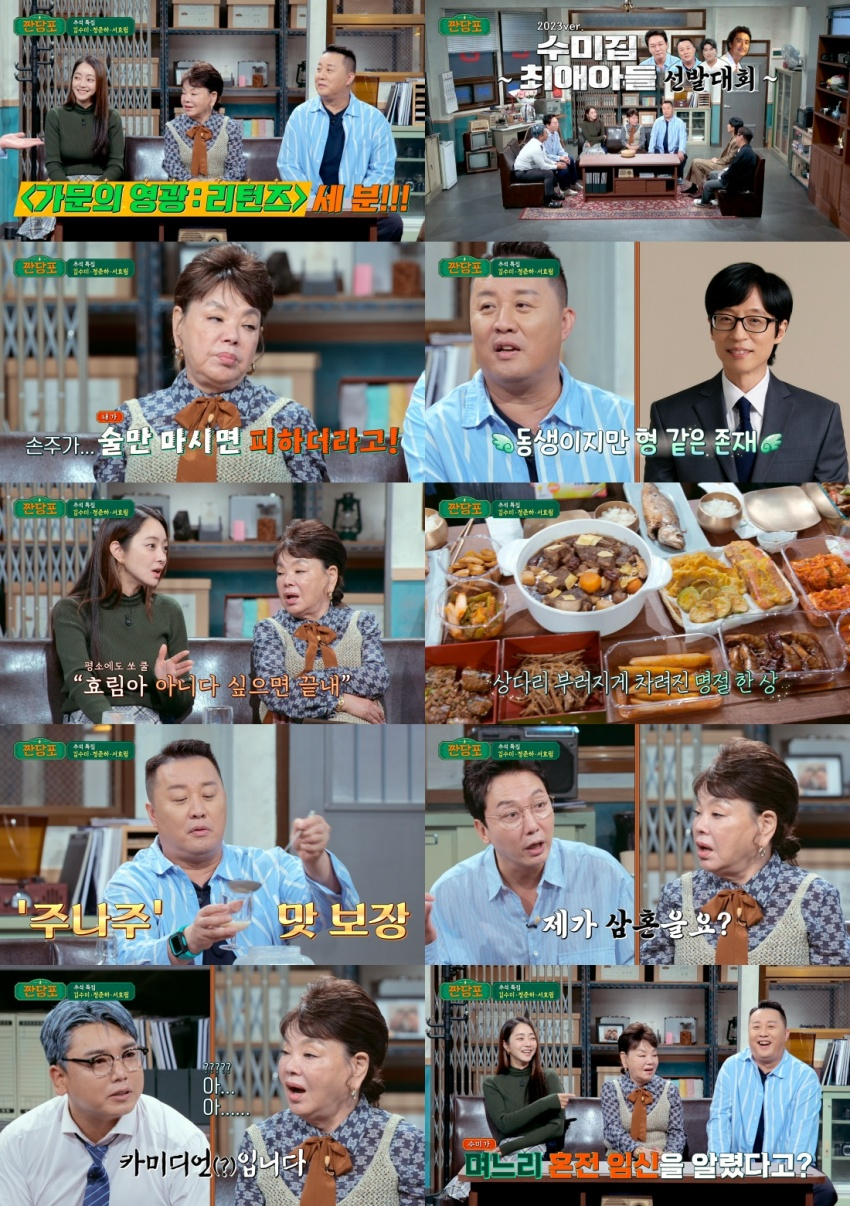 서효림은 술만 먹으면 주변 사람들에게 전화하는 남편의 술버릇을 폭로했다. 이에 대해 김수미는 "서효림이 남편 때문에 속상할 때 연락이 왔었다"며 "나는 잘 생각해 보고 아니다 싶으면 끝내라고 했다"고 밝혀 모두를 놀라게 했다. 하지만 김수미는 이내 아들의 술버릇이 본인을 닮았다고 고백해 폭소를 자아냈다. MC들이 이제는 술을 끊었냐고 묻자 "술을 마신 자신을 피하던 손자를 보고, 좋은 할머니가 되어야겠다고 깨달아 단칼에 술을 끊었다"고 답했다.