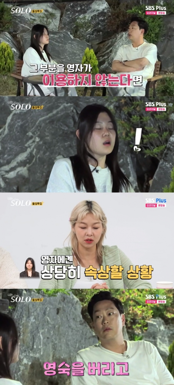 하지만 영철은 "근데 이 부분이 방송을 위한건지, 아니면 상철 님에 관심이 있는 건지. 상철 님은 진심이다. 그 부분을 영자가 이용하지 않는다면 내가 상철님에 대한 마음을 전달해 주겠다"며 영자의 마음을 멋대로 넘겨짚었다. 영자는 영철의 '이용'이라는 표현에 크게 당황해 입을 다물지 못했다.