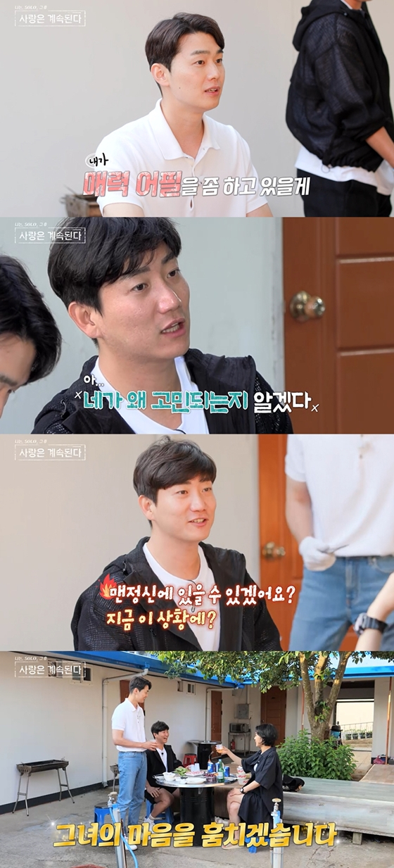 어색한 분위기 속, 영식은 묵묵히 고기를 굽기 시작하고, 이에 영철은 "영식이가 고기 구울 동안 내가 매력 어필 좀 하고 있을게"라며 훅 치고 들어간다. 이에 빵 터진 현숙은 "건배사는 영철이가 한 번 해보거라"며 너스레를 떤다. 영철은 "무거운 마음으로 왔다"며 "오늘 저는 괴도 루팽이 되겠다. 그녀의 마음을 훔치겠다"고 선포한다. 영철의 불도저 직진에 영식은 '동공지진'을 일으키며 '말잇못' 한다.