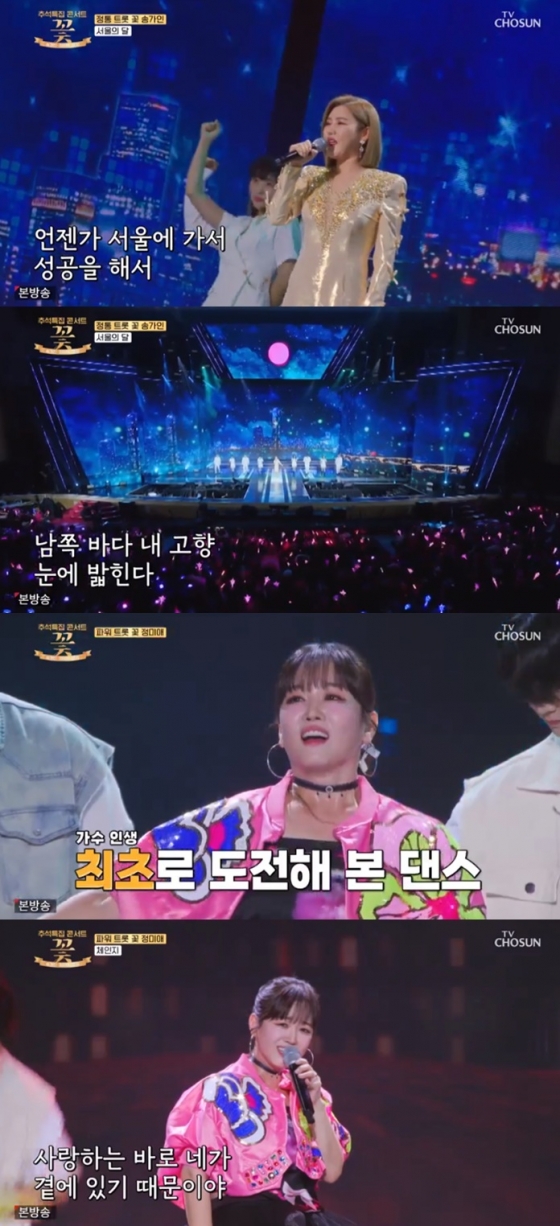 29일 방송된 TV조선 추석특집 프로그램 '꽃'에서는 '내일은 미스트롯1'의 진·선·미, 송가인·정미애·홍자가 한가위를 위해 3년 만에 뭉쳤다.