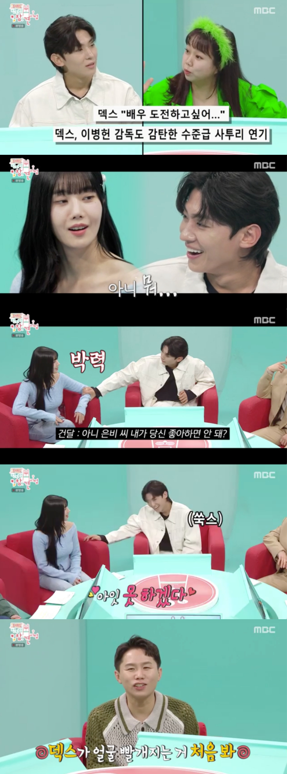 덱스는 이후 권은비를 상대로 건달 연기에 도전했다. 덱스는 수줍음을 떨치지 못해 몇 차례 망설이다 "아니 은비 씨 내가 당신 좋아하면 안 되냐"며 권은비의 팔을 박력 있게 잡아 여심을 사로잡았다.