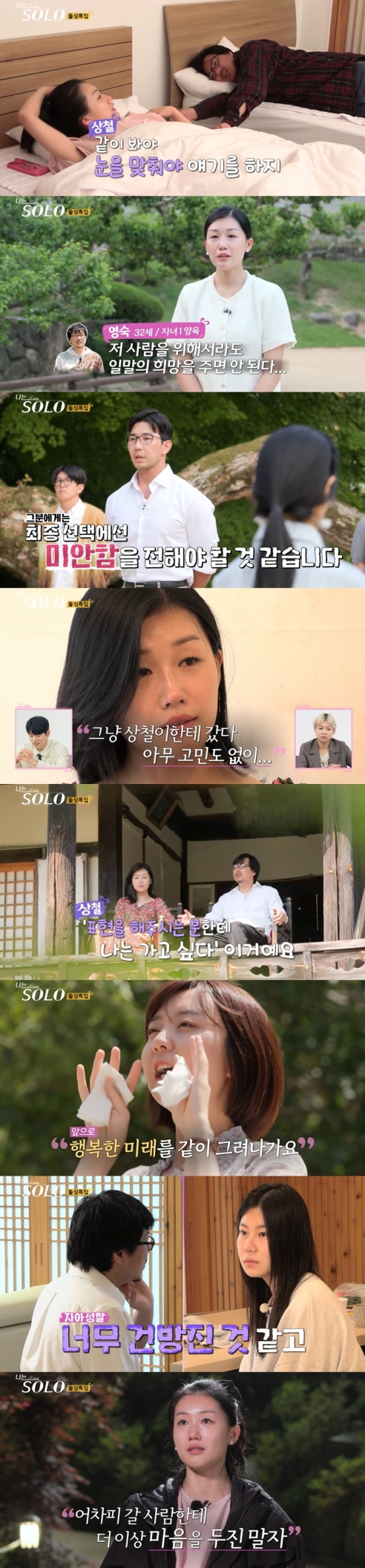 4일 방송한 ENA와 SBS Plus의 리얼 데이팅 프로그램 '나는 SOLO'에서는 영식-현숙, 영철-정숙이 최종 선택에서 커플이 되어 다사다난했던 16기 '돌싱 특집'의 로맨스를 훈훈하게 마무리하는 모습이 그려졌다. 반면 영숙은 상철의 직진에도 최종 선택을 포기하면서 "일말의 희망을 주면 안 된다고 생각했다. 난 엄마니까..."라고 털어놓아 3MC는 물론 시청자들을 울컥하게 만들었다.