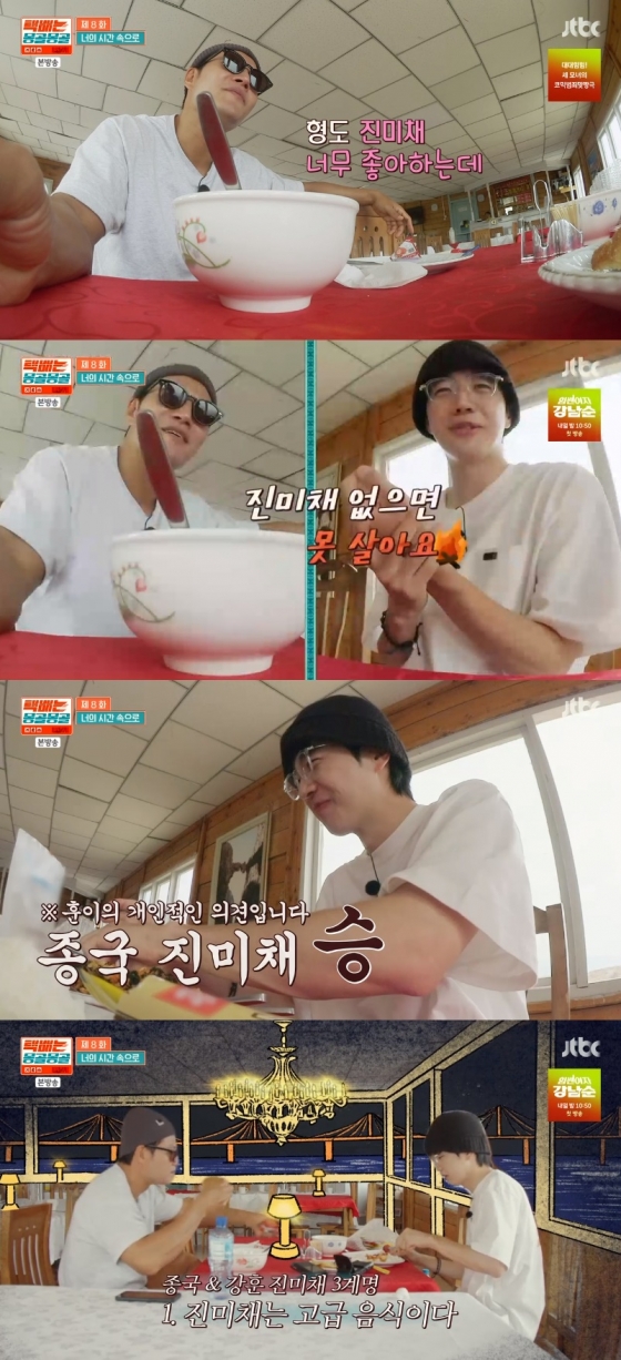 이어 두 사람은 서로가 가져온 진미채를 시식해보며 감탄을 쏟아냈다. 이후 강훈은 '혼밥을 많이 하냐'는 질문에 "난 그런 거 부끄러워하지 않는다"고 답했다.