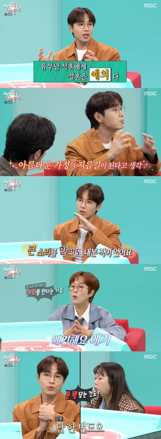 이에 결혼 생활 중 꼭 지키는 예의가 무엇이냐고 묻자 이석훈은 "큰 소리를 한 번도 내본 적이 없다"라고 답했다.