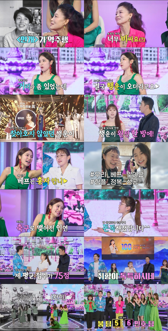 이날의 '행운요정'은 방송인 박슬기였다. '미스트롯2'에 출연한 바 있는 박슬기는 양지은, 홍자, 은가은 등과 친분을 자랑했다. 특히 홍자에 대해서는 "피와 살을 나눈 사이"라고 말하며 "축구를 하면서 친해졌다. 서로의 땀냄새를 맡아가면서 막역한 사이가 됐고, 여행도 같이 다녀왔다"고 찐친임을 드러냈다.